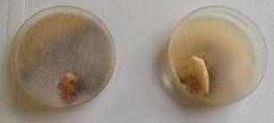 Due metà di uno stesso spicchio di mela: le due muffe differiscono solo per l’estensione della zona grigia vellutata.
