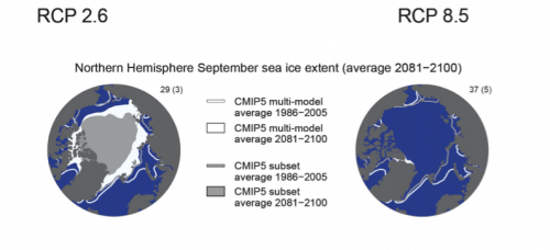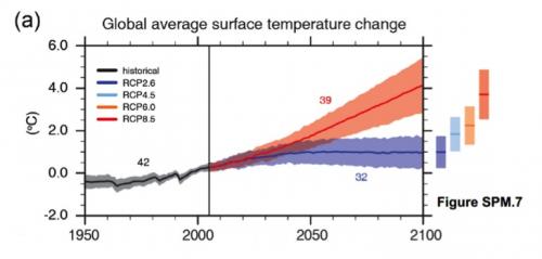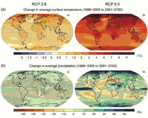 New categories replaced the SRES scenarios used in the former report (with the well-known BAU, or A1FI, representing the businness-as-usual). The brand-new scenarios are named Representative Concentration Pathways (RPCs) and for the first time include hypotheses of global mitigation action that will effectively reduce GHG emissions. The RCP2.6 scenario represents an “high mitigation” future, the RCP8.5 a “very high greenhouse gas emissions” option. Looking at Figures a) and b), it is easy to grasp that the difference between the two options is quite significant.