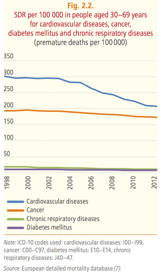 Europe is on track to achieve the Health 2020 target to reduce premature mortality from cardiovascular diseases, cancer, diabetes mellitus and chronic respiratory diseases by 1.5 percent annually until 2020. However, there are other challenges for the European Region, like those concerning health inequalities among countries.