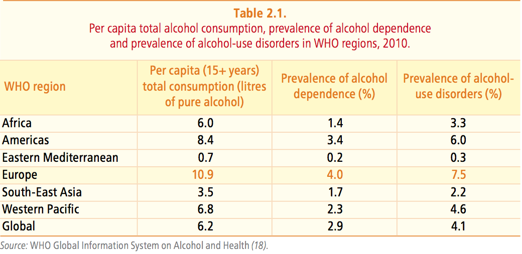 Alcohol intake in the European Region is the highest in the world, resulting in a higher prevalence of alcohol dependence and alcohol-use disorders than in other WHO regions. Nevertheless, levels of alcohol consumption vary greatly between European countries, ranging from 0.32 to 14.37 litres per capita annually.