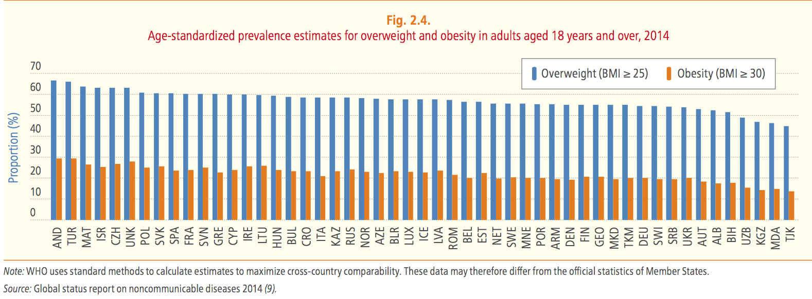 About overweight and obese people, the situation has worsened. In 2014, the prevalence of overweight persons – a body mass index (BMI) of 25 or above – in 51 countries in the European Region ranged from 44.9 percent to 66.9 percent, while the prevalence of obesity – a BMI of 30 or above – ranged from 13.6 percent to 29.5 percent. That means that in some countries 1 out of 3 of the inhabitants is obese. Its prevalence has tripled in many countries in the European Region since the 1980s.
