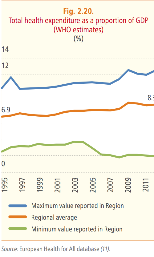 As WHO has stressed many times also during the latest RC in Vilnius, in healthcare there is also a cost for non acting. A universal health coverage is fundamental to achieve the Health2020 goals for the reduction of mortality and health inequalities. But actions need investments and during the last years the total health expenditure as a proportion of GDP across the European Region did not increase. The regional average has been more or less stable, at around 8.3 percent, since the 2010 baseline, and it represents today one of the most impressive example of social inequality. It differs considerably between countries in the European Region, ranging from 2.0 percent to 12.4 percent in 2012.