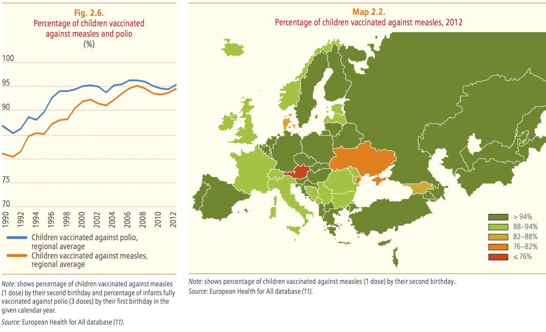 To conclude, health coverage also means immunization coverage. The second quantification for Health 2020 first target is the sustained elimination of selected vaccine-preventable diseases, for which the core indicator is the percentage of children vaccinated against measles, poliomyelitis and rubella. In general, there are good news: the average vaccination coverage for measles in the European Region increased in the last years, from 93.4 percent in 2010 to 94.6 percent in 2012, and the average vaccination coverage for polio was 94.7 percent. However – again – it is not true for all countries, as represented by the recent polio outbreak in Ukraine. More action is therefore needed to achieve the target of eliminating vaccine-preventable diseases, particularly focusing on closing immunity gaps in the population by improving subnational and second-dose coverage rates and by reaching specific population groups.