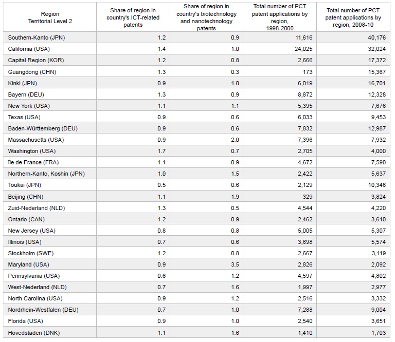 Figure 1.50 Innovation hotspots in ICT, biotechnology and nanotechnologies