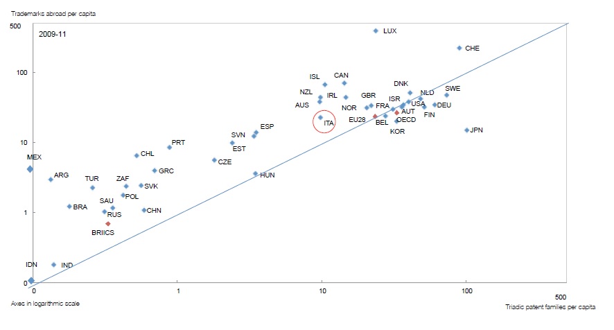 Competing in the system of knowledge-economy also means protecting the products of intellect with patents and trademarks. Using the number of trademarks as indicator of the level of innovation for a country is very convenient because data on applications are public, therefore they continuously provide an updated snapshot of the innovation status of the country. Italy seems to be more inclined to protect trademarks than patents, as it is shown by the number pro capita of these instruments, which once again place our country as the last country among the first ones, i.e. the group including several countries of Northern and Central Europe, US, Canada, Japan, Korea and Australia.