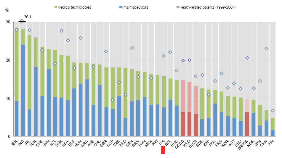 If we examine the years 1999-2001 up to 2011, Italian patents in the health sector represent the 21%, a percentage higher than the average of OCSE countries.