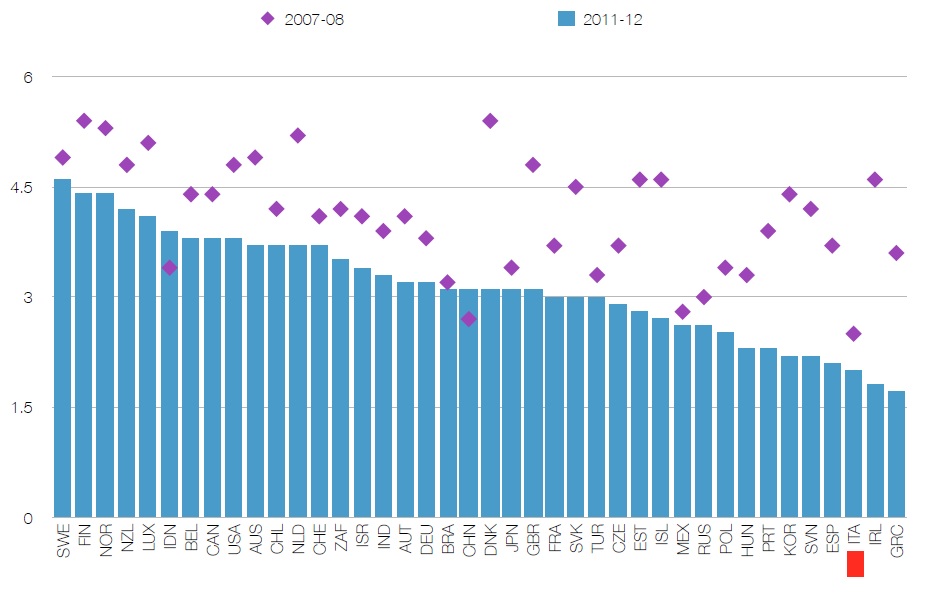 One of the consequences of the financial crisis is the increasing difficulty, for start-ups, to access loans from banks, whilst venture capitals started avoiding risks and now prefer bigger and more stable investments. The decrease in credit access is clear from the table below, which shows how in the last four years only China and Indochina have improved under this aspect. Unfortunately, Italy is third from the last followed only by Ireland and Greece, demonstrating to be a country that does not encourage start-ups.