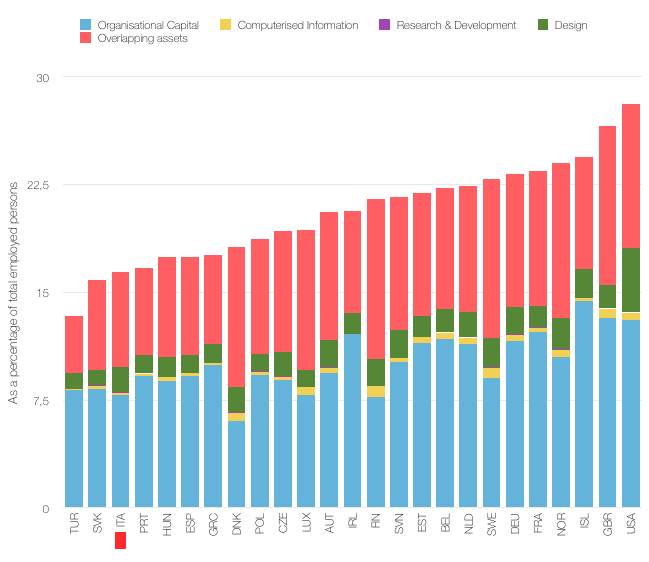 The level of workers’ technological and scientific education is crucial for any country. For this reason OCSE has developed an experimental indicator that measures the knowledge-based capital in relation to education and tasks of industry employees in different countries (researchers, designers, computer technicians and other qualified figures who can make a difference in a firm). Among OCSE countries, 13% is the minimum (Turkey) and 28% is the maximum (US) of added knowledge-based capital related to workers. Italy ranks quite low among the countries.