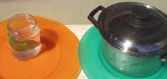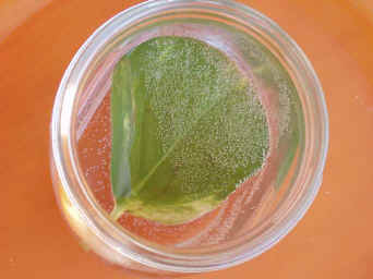 Il modo più semplice per vedere l'ossigeno prodotto dalle foglie è di fare come in queste foto. Le foglie, sia quella esposta al sole, sia quella tenuta al buio, sono immerse in acqua di rubinetto. L'esperienza è durata appena mezz'ora... e i risultati si vedono!