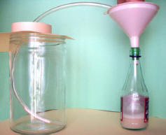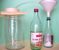 L’aceto va versato poco per volta, senza agitare. Quindi si preme il tubo nel collo dell’imbuto e si agita gradualmente, in modo da controllare la schiuma ed evitare che vada a finire nel tubo. Il gas attraverserà l’ovatta ed entrerà nel barattolo, stratificandosi dal basso e scacciando l’aria dalla sommità. |