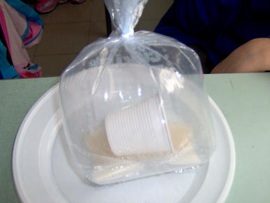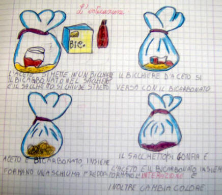 Hanno cominciato a scuotere il sacchettino e all'improvviso si è fatto silenzio: ognuno osservava la " schiuma bianca" che faceva rumore, il sacchetto che si è gonfiato e l'aceto che è "diventato freddo". " Maestra, è cambiato tutto!" Allora cerchiamo di capire cosa può essere successo, ha detto l'insegnante di classe, proponendo di intervenire uno alla volta per esprimere la propria opinione. "Si sono mischiati l'aceto e il bicarbonato, hanno fatto la schiuma con le bollicine come la coca cola. Ma il sacchetto si è gonfiato di aria, ma è chiuso: l'aria non poteva entrare!" " E' l'aria delle bollicine che si sono formate" " A me si è gonfiato di più perchè ho fatto fare più schiuma agitando velocemente" Un bambino ha detto: il bicarbonato e l'aceto insieme si trasformano, si cambiano. L'aceto fa un'azione sul bicarbonato, lo fa cambiare." " Anche il bicarbonato fa cambiare l'aceto! Ora è diventato più scuro" Un bambino ha proposto di scrivere alla lavagna: aceto e bicarbonato e cosa era cambiato: schiuma, colore, aria nel palloncino.