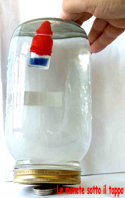 Quando il barattolo è inclinato verso l'alto, le monete non premono sul tappo e il sommergibile è in emersione. Basta appoggiare il tappo sulle monete e premere per avere l'immersione; a causa della contrazione della piccola camera d'aria, il sommergibile riscende........risale....