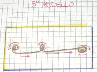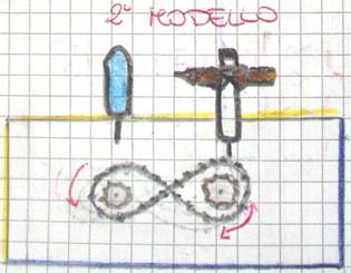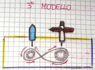Nella scatola ci sono 3 perni su cui gira uno spago. Nei due perni laterali si infilano la penna e il tappo, mentre quello centrale sere a far cambiare direzione al filo. Il limite di questo modello è che lo spago finisce e la macchina non gira più nello stesso verso. |