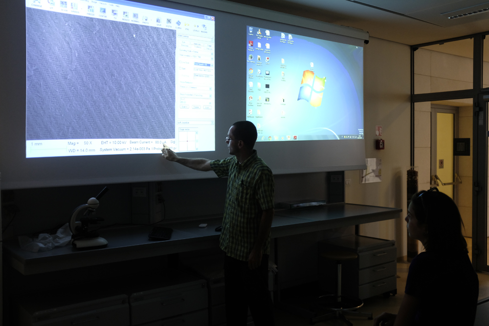 Salutiamo anche Uli – senza sosta questo Terramare! - e, insieme a Nicola Angeli del MUSE, il Museo delle Scienze di Trento, visitiamo la Stazione Limnologica del Lago di Tovel e le sue attrezzature per l'osservazione di campioni biologici “vivi”, ovvero microscopi e computer. Nicola ha prelevato campioni dalle rocce in riva al lago grattandole con uno spazzolino. I protagonisti dell'osservazione sono le diatomee, alghe unicellulari con uno scheletro di materiale vitreo dalle forme meravigliose e che, fattore tutt'altro che secondario, a scala globale producono tra il 20 e il 40% dell'ossigeno presente sulla terra. Rivediamo questi esseri nel pomeriggio, quando, salutato il lago, lanciati sulle bici verso fondovalle, attraversata la Valle dell'Adige lungo la ciclabile che segue la “Via Claudia Augusta”, arriviamo a Trento, nella sede del MUSE. Nicola, mostrando diapositive su di uno schermo a muro, ci porta nel mondo della osservazione al microscopio elettronico a scansione (o SEM), uno strumento in grado di far apparire grande quanto una pizza un organismo discoidale delle dimensioni di dieci millesimi di millimetro, come appunto una diatomea.