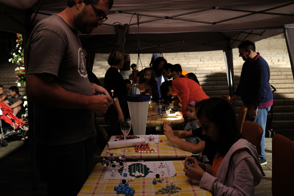 La nostra giornata – e che giornata! – si conclude a Levico Terme, sorseggiando un bianco offerto dalla Cantina Romanese e invecchiato in bottiglia sul fondo del lago di Levico (a meno di 40 m), dalle acque pulitissime e meta di turisti in tutte le stagioni. Discorriamo anche con Monica Tolotti della FEM sull'uso della paleolimnologia per “andare indietro nel tempo”, osservando la stratigrafia del lago di Levico e gli organismi che si ritrovano all'interno di strati diversi e risalenti ad epoche distinte. Monica è venuta col suo carico di poster divulgativi che espone ad un piccolo pubblico convenuto al nostro evento. Mentre parliamo con Monica, va in scena anche qui, sotto alcuni gazebo forniti dalle autorità locali, la scienza in piazza, con “la vita in una goccia d'acqua”: piccoli e grandi con il naso all'ingiù e gli occhi ai microscopi. Ma anche ragazzini impegnati a comporre molecole con modellini di atomi e legami, a “immaginare realizzandole”, sotto la guida di Andrea Zignin, le due reazioni chimiche fondamentali e complementari della natura vivente, ovvero la fotosintesi e la respirazione. Del resto, gli scienziati in bicicletta sono soprattutto questo, dei “cantastorie di scienza” in continuo movimento. Portano conoscenza alla gente dei posti che visitano, anche in cambio di un bel bicchiere di vino!