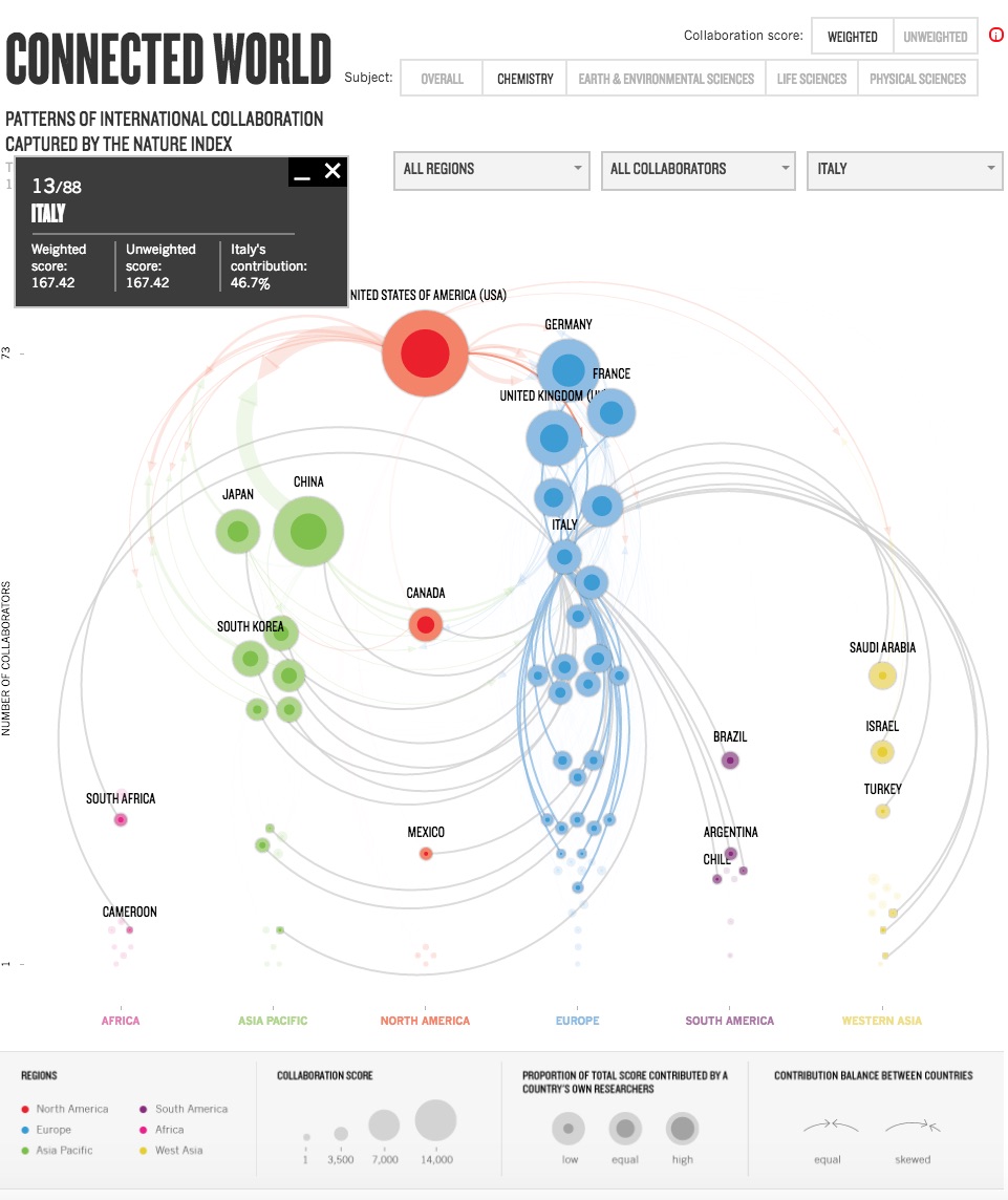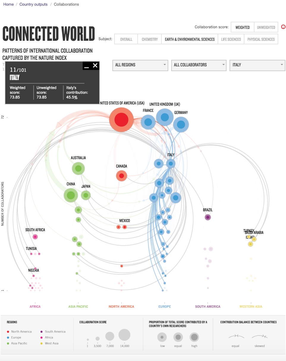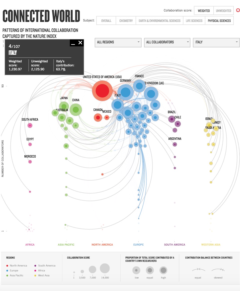 La rivista Nature ha pubblicato in questi giorni una piattaforma ricca di dati, navigabili in modo semplice e interattivo, che raccontano il mondo delle collaborazioni scientifiche fra i diversi paesi del mondo, proponendo una classifica delle 100 istituzioni più “virtuose” in questo senso, secondo il Nature Index, che misura le occorrenze delle affiliazioni degli autori di articoli pubblicati sulle 68 maggiori riviste scientifiche mondiali fra il 1 settembre 2015 e il 31 agosto 2016.