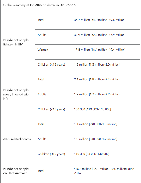 E’ da pochi giorni disponibile il rapporto di UNAIDS (Joint United Nations Programme on HIV/AIDS) sulla situazione globale dell’infezione da HIV e sull’AIDS che ne è la conseguenza in assenza di terapia antiretrovirale di combinazione (cART). Una buona notizia, seppur parzialmente, è il fatto che oltre 18 milioni di persone nel mondo (tra cui 910.000 bambini) stanno attualmente ricevendo la cART, un numero mai raggiunto prima e che fa ben sperare di giungere al traguardo di 30 milioni di persone in cura entro il 2020.