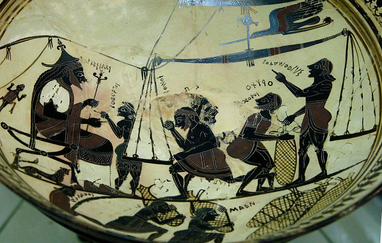 La Coppa di Arkesilas conservata al Cabinet des médailles: Arcesilao II di Cirene assiste alla pesatura del silfio. Licenza CC BY 2.5
