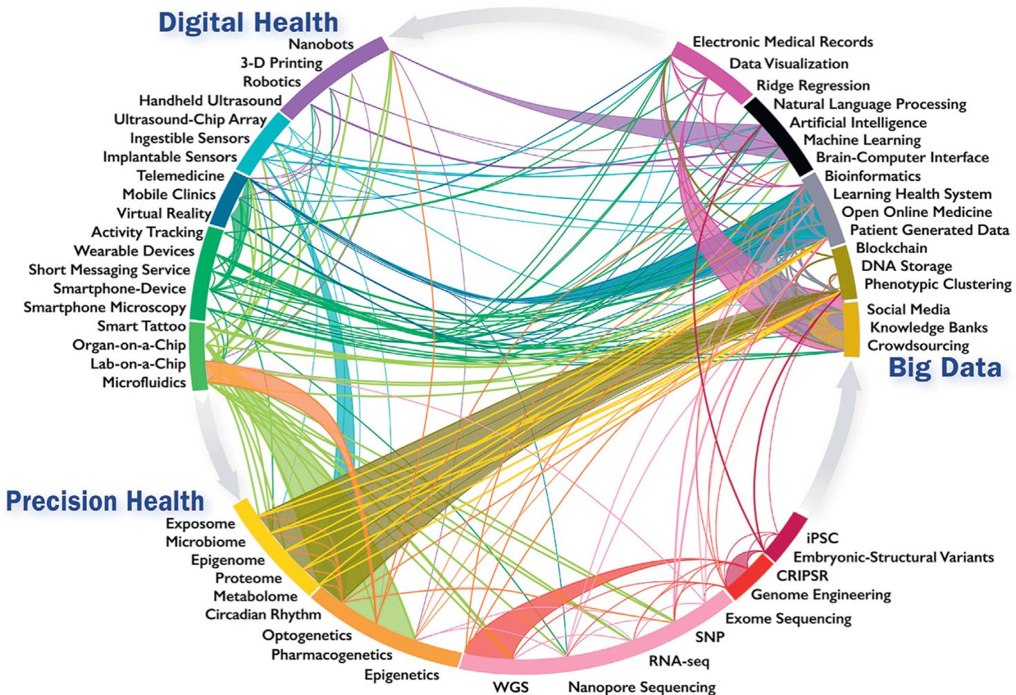 Figura 3. Infografica di innovazioni e sviluppi emergenti nella salute digitale, big data e medicina di precisione: intra- e interconnessioni (Credit: Statement on Healthcare transformation in the era of Digital Health, Big Data and Precision Health