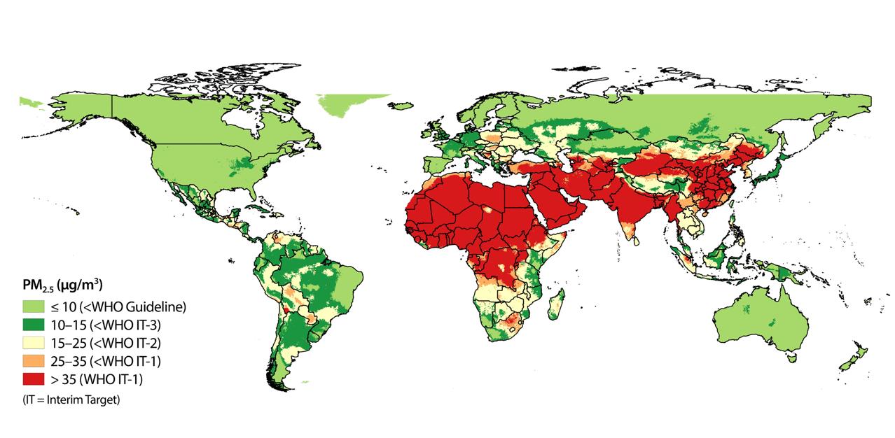 Figura 5. Livelli di concentrazione media annuale di PM2,5 (particolato atmosferico fine, più comunemente dette polveri sottili) espressi in mg/m3 nelle diverse aree del pianeta (Credit: Health Effects Institute, 2018. State of Global Air 2018. Special Report. Boston, USA)