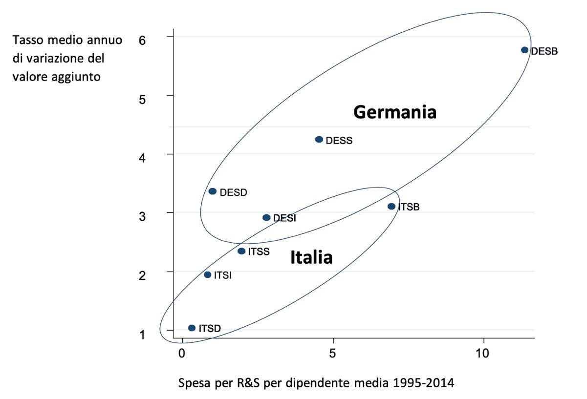 Figura 1. Spesa per R&S e crescita del valore aggiunto nell’industria manifatturiera in Germania (DE) e Italia (IT), 1995-2014. Settori Pavitt rivisti: SB industrie basate sulla scienza; SS produttori di macchinari; SI industrie ad alta intensità di scala; SD settori tradizionali