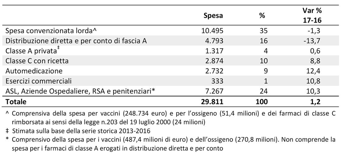 Tabella 2. Composizione della spesa farmaceutica in milioni di euro: confronto 2017-2016