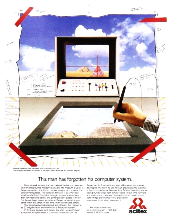 Nel frattempo, altri attori internazionali si erano affacciati, nei primi anni ’70, al comparto delle tecnologie digitali destinate agli usi militari: è il caso della azienda israeliana Scientific Technologies, nata nel 1968 e diventata successivamente Scitex, che sviluppò per prima, già a metà degli anni ’70, una workstation elettronica (dal nome Response 300) pensata per il mercato del prepress e che nei primi anni ’80 si è imposta come la prima macchina per il desktop publishing che permetteva di scannerizzare e ritoccare le immagini a colori destinate alla stampa.