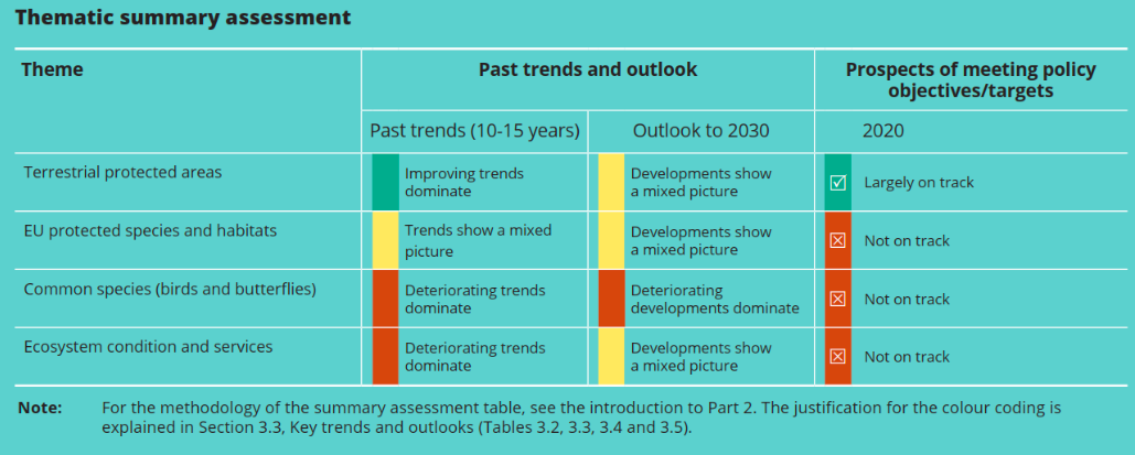 Le direttive UE sugli uccelli e gli habitat costituiscono la spina dorsale della legislazione sulla conservazione della natura. A livello dell'UE, solo il 23% delle specie indica uno stato di conservazione favorevole mentre per gli habitat protetti è solo il 16%. Il 17% delle specie di uccelli è a rischio e un altro 15% è in declino o estinto. Le popolazioni di farfalle dei prati sono diminuite del 39% in 15 Stati membri dell'UE dal 1990.