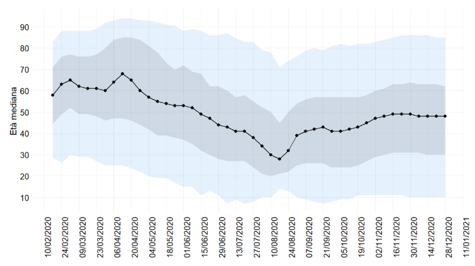 Figure 1: Età mediana dei nuovi infetti Covid-19 in Italia in funzione del tempo. Si nota, dopo agosto, un incremento rapido, un periodo di sostanziale stabilità dai primi di settembre a metà ottobre, e poi un’ulteriore graduale risalita. Area grigia percentili 25-75, area blu chiaro percentili 5-95. Fonte www.epicentro.iss.it
