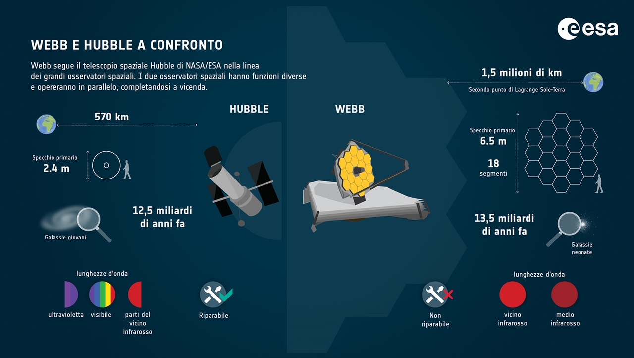Poiché, spesso, si sente parlare del JWST come del sostituto del telescopio spaziale Hubble, credo sia opportuno partire proprio dalle enormi differenze che li separano. Differenti sono, anzitutto, le caratteristiche della radiazione che essi raccolgono: mentre Hubble sta osservando principalmente a lunghezze d’onda ottiche e ultraviolette, benché abbia anche la capacità di osservare nel vicino infrarosso, Webb osserverà esclusivamente nell’infrarosso. Questo, unito alla maggiore dimensione dello specchio principale e alla elevata sensibilità della strumentazione, gli permetterà di mostrarci un Universo ancora più giovane di quanto stia facendo Hubble.