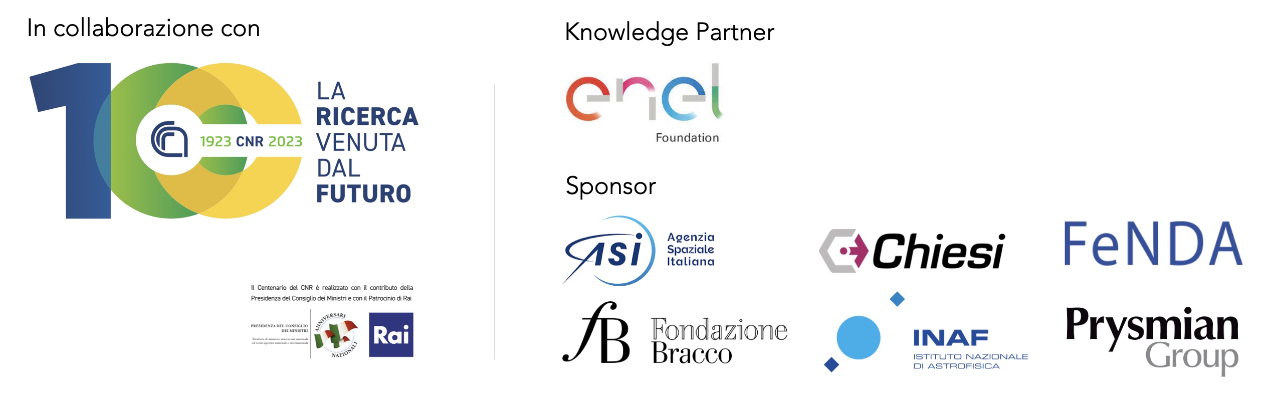 Il Premio giovani ricercatrici e ricercatori 2023 è in collaborazione con il Consiglio Nazionale delle Ricerche, ed è sostenuto da: Fondazione Enel (Knowledge Partner)* e da Agenzia Spaziale Italiana **, Chiesi, Federazione Nazionale Dirigenti e Alte Professionalità dell'Agricoltura e dell'Ambiente, Fondazione Bracco ***, Istituto Nazionale di Astrofisica, Prysmian Group.