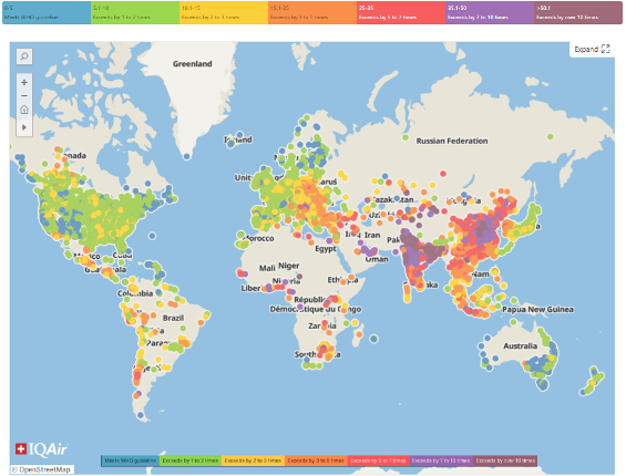 Mappa globale interattiva delle concentrazioni di PM2.5 del 2024 per città.