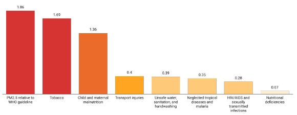 L'inquinamento atmosferico da particolato riduce di 2,2 anni l'aspettativa di vita media globale, ovvero 17 miliardi di anni di vita complessivi, in confronto a un mondo che rispetterebbe le linee guida dell'OMS (PM 2.5 inferiore ai 5 µg/m³). Un impatto paragonabile a quello del fumo, più di tre volte maggiore di quello dell’alcol e dell'acqua non potabile, sei volte superiore a quello dell'HIV/AIDS e quasi 90 volte a quello dei conflitti e del terrorismo.
