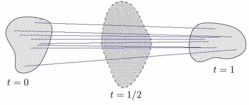 Il lavoro di Brenier fu importante non solo per il risultato in sè (ossia l’esistenza e unicità di un trasporto ottimale quando il costo è proporzionale alla distanza al quadrato), ma soprattutto per aver mostrato una connessione con problemi derivanti dalla meccanica dei fluidi. Questa è sicuramente una delle proprietà che sono alla base del successo del trasporto ottimale nella comunità dei matematici: il fatto di avere legami con altri settori della matematica. Infatti, il caso di Brenier fu il primo ma tutt’altro che l’ultimo: durante la metà degli anni ’90 del secolo scorso Robert McCann, che stava studiando la meccanica dei gas, mostrò che il trasporto ottimale si poteva applicare anche in questo contesto: l’idea di fondo è che, una volta noto come trasportare una distribuzione di massa (o gas) da una configurazione a un’altra, si può vedere questo come un processo continuo: se il trasporto ottimale invia un punto x su un punto y, allora si considera il segmento che congiunge x a y e si decide di muovere il punto x a velocità costante lungo questo segmento in modo che al tempo 0 si trovi in x e al tempo 1 si trovi in y. Così facendo, per ogni istante di tempo t compreso tra 0 e 1(0<t<1), il gas assume una famiglia di configurazioni “intermedie” che interpolano in maniera naturale tra lo stato iniziale e quello finale.