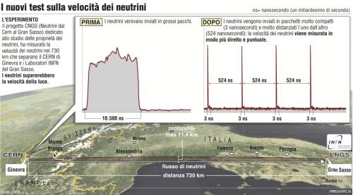 It is not yet a final confirmation, but the hypothesis that neutrinos actually go "faster than light" is gaining strength. Following a new experiment conducted inside OPERA, it is now possible to exclude some potential errors that could have been ascribed to previous measurements. In the new test, the beams of neutrinos sent from CERN were shorter in time and spaced farther apart; they were then analyzed at the Gran Sasso National Laboratories. The new bundles are characterized by "a better definition of the extraction time of protons. That is, the neutrinos packets are only 3 nanoseconds long and spaced from each other by 524 nanoseconds. They are much narrower and more spaced compared to those of the announced result in September: in that case, the beams lasted 10 500 nanoseconds and were separated by 50 million nanoseconds" according to declarations by the National Institute of Nuclear Physics.