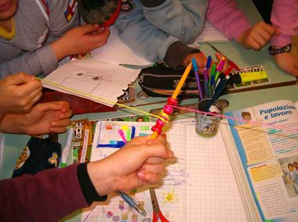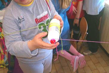 LA SCATOLA ROSSA La seconda scatola era rossa, il rumore che proveniva dal suo interno era minore dell’altra. Abbiamo visto che se tiravi tutti e due i fili la scatola , appoggiata sul tavolo, si muoveva solo dalla parte del filo rosso. Se tiravi il filo rosso il giallo entrava di più, invece se tiravi quello giallo il rosso entrava di meno.Infatti la cosa strana era che tirando il filo giallo di 30 cm. il filo rosso si accorciava di 17cm.. Abbiamo detto in classe come poteva accadere perché il professore ci aveva detto di immaginare il funzionamento così come hanno fatto gli scienziati con il Sole perché “…non ci si può andare”. Abbiamo capito che c’erano due rullini, ma come faceva? Abbiamo discusso molto e alla fine abbiamo capito che doveva esserci uno più grande e uno più piccolo , così abbiamo creato un modello. La maestra è andata a prendere un tubetto di colla, pensando di doverne cercare poi uno più piccolo ma Asmaa, intuendo quello che la maestra stava pensando, si è accorta che nel tubo del vinavil erano presenti già grandezze diverse. Abbiamo arrotolato, allora, i due fili, uno sul tappo e uno sul contenitore, ci abbiamo provato e dopo un po’ ci siamo riusciti; il mistero era ormai risolto.