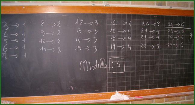 Fase 3: il software I bambini iniziano col primo livello della MO11 e, dopo aver ascoltato ciò che Merlino aveva da dire, propongono dati in input, scrivono i dati su un foglio e discutono tra loro sulle operazioni possibili. Si scoprono alcune caratteristiche delle MO: uno stesso numero può essere riproposto, ottenendo lo stesso risultato (riproducibilità degli esperimenti). Dopo vari successi i bambini decidono di passare al livello 2. Qui scoprono, ad esempio , che l’operazione della sottrazione, quando il sottraendo è più grande del minuendo, produce zero come risultato e che se una divisione ha resto, la macchina fornisce come output il quoziente senza resto. Fieri delle loro scoperte, essendo rimasto poco tempo, i bambini decidono di tentare il terzo livello, ma si imbattono subito in caso strano: l’esperimento con il 2 fornisce sempre 2 come risultato. Sembrerebbe che la macchina esegua l’operazione di “=”. Ma con 3 si ottiene 1, quindi la cosa non è così semplice. I bambini provano alcuni altri di input sparsi, ottenendo sempre o 1 o 2 come uscite. Riuscite a far uscire da quella macchina degli output diversi da 1 o da due? Provando con numeri in ingresso più alti si ottengono anche il tre e il 4, cosicché il mistero si infittisce. Visto che con gli input 13, 14, 15 si ottiene sempre lo stesso risultato, 3, mentre con numeri più grandi si trova il 4, ci chiediamo quand’è che “scatta” il 4; troviamo che ciò accade dal 16 al 19 per 4 ripetizioni. Completiamo la lista degli input per i numeri da 1 a 26 e a questo punto salviamo il meccanismo insoluto. Ci trasferiamo in classe, dove la mastra copia l’elenco degli input e degli output finora usciti in forma ordinata…Wow! Ogni output si ripete regolarmente ogni 4 input consecutivi.