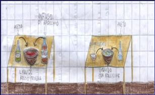 La maestra ha portato a scuola questi materiali ed oggetti: � Lana di ferro, � Magnete, � Guscio d�uovo, � Infuso di radicchio filtrato, � Aceto, � Bicarbonato. Abbiamo formato quattro gruppi. Ogni gruppo aveva un vassoio di alluminio con dei bicchieri di plastica trasparenti vuoti ed altri di plastica bianca. Abbiamo abbinato i materiali a coppie, usandone solo una parte ogni volta. Dovevamo scoprire pi� cambiamenti possibili. In ogni gruppo � stato scelto un responsabile della registrazione dei dati. Abbiamo avuto a disposizione anche un secchio con acqua pulita e uno vuoto per scaricare i risultati delle prove e sciacquare i contenitori. La maestra e il tutor hanno costruito alla lavagna una tabella a doppia entrata con i 5 materiali in riga e in colonna nello stesso ordine;hanno poi numerato le caselle coorrispondenti ad ogni diverso abbinamento da 1 a 10.