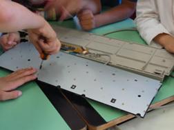 A coppie i bambini costruiscono un circuito con la carta stagnola, e lo fanno poi provare ad un’altra coppia di compagni. Inseriscono anche “falsi collegamenti” , in modo che dai fori si intraveda la carta stagnola ma che in reltà non vi sia poi collegamento con altre lettere.
