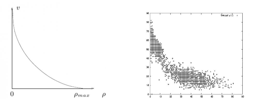 Figura 1: possibile diagramma delle velocità in funzione della densità dei veicoli (a sinistra) e i corrispondenti dati dei rilevamenti sperimentali sperimentali (a destra, in ordinata le velocità rilevate, in ascissa la corrispondente densità di veicoli).