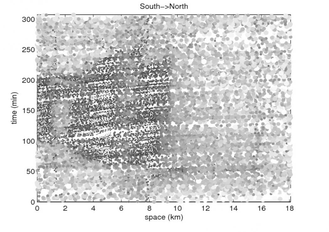 Quando si hanno a disposizione molti dati, è naturale cercare delle 'regolarità' nascoste in essi. Guardate ad esempio la Figura 2, in cui sono riportati dei dati reali di traffico automobilistico catturati da sensori GPS montati sui veicoli. La posizione di ogni cerchio indica una particolare posizione e un particolare orario. La grandezza ed il colore dei cerchi denotano la velocità del veicolo. La zona più scura a sinistra indica una grande congestione, con code che hanno raggiunto i 9 km di lunghezza e si sono protratte per più di un'ora e mezza.