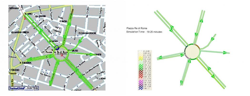 Figura 4: Immagine della rotatoria di piazza Re di Roma (Roma) e risultato della simulazione corrispondente che utilizza il modello fluidodinamico su rete.