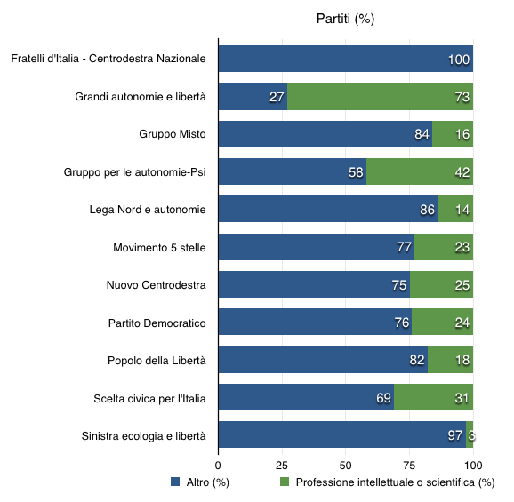 Dai dati che seguono si misura quanto sia esigua la proporzione di professioni scientifiche e più generalmente intellettuali sia nel governo sia nel Parlamento. (E anche la percentuale di laureati, PhD e alti dirigenti è assai inferiore ai parlamentari di Francia, Germania e Gran Bretagna, ma su questo torneremo). Almeno nel tasso di scienziati e intellettuali, come vedremo, il governo Renzi non rappresenta una discontinuità rispetto al passato, nonostante il tanto parlare di "società della conoscenza" e "cittadinanza scientifica".