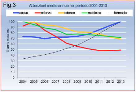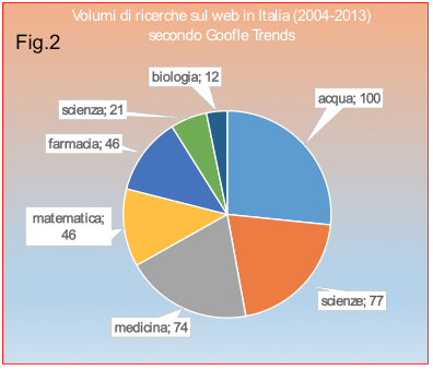 I risultati precedenti non sono di facile lettura. Per aiutarci aggiungiamo all’analisi altri termini di confronto ricollegabili, quali quelli relativi ad alcune discipline tra le più seguite: Medicina, Matematica, Farmacia, Biologia (le ultime due non erano state considerate nel Rapporto ECWPP). Il diagramma a torta in figura 2 riassume i rapporti tra i volumi complessivi delle ricerche da parte del pubblico nel decennio. Acqua (il cui volume di attenzioni è stato posto =100, come parametro di confronto) è stata la parola-chiave più cliccata, seguita da Scienze (77%). Tra le discipline prima è stata Medicina (74% di Acqua), seguite a pari merito (46%) da Matematica e Farmacia. Ultime Scienza (21%) e Biologia (12%).
