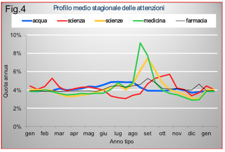 I precedenti volumi relativi di attenzioni ci possono dare indicazioni interessanti (le Università competono su questo terreno), ma variano nel tempo. E’ dalle dinamiche che possiamo riconoscere i processi in corso. Il diagramma in figura 3 riporta gli andamenti per cinque tra i termini precedenti, espressi come medie annue ponendo =100 l’anno di massimo interesse. Ritroviamo quantificandoli gli andamenti già riconosciuti visivamente dal primo grafico: un aumento discreto di Acqua, riduzioni evidenti per Scienze ma soprattutto per Scienza (un dimezzamento). Vediamo poi il nettissimo aumento di Farmacia (le attenzioni sono triplicate nel decennio), ed il discreto calo di circa 30 punti nel decennio di Medicina, e di Scienze.