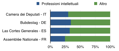 L’Italia si distingue per un alto numero di docenti, in particolare professori universitari, conquistati dalla politica. I ricercatori e gli scienziati non mancano ma sono meno che nelle camere degli altri paesi.