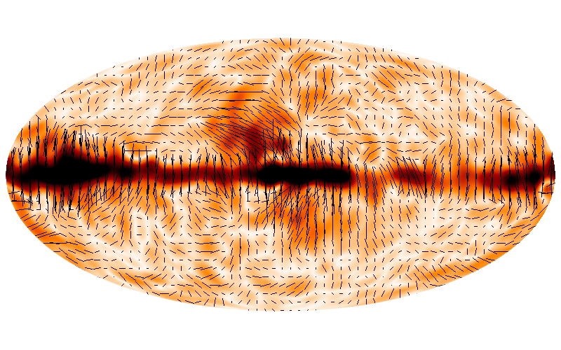 Didascalia: La mappa della polarizzazione della CMB, ottenuta osservando tutto il cielo alla frequenza di 70 Hz, che è stata presentata dal team di Planck in occasione del convegno di Ferrara. La scala dei colori indica il grado di polarizzazione, crescente dal bianco al nero; i segmenti indicano i piani di polarizzazione