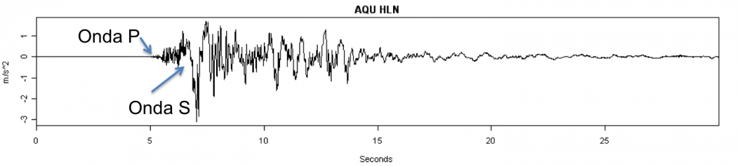 1. La storia sismica italiana insegna che i terremoti causano i danni e le vittime in prossimità dell’epicentro, dove la differenza di tempo tra le S e le P è dell’ordine di un paio di secondi (altro che decine!). Qui sotto un esempio: si tratta del terremoto del 6 aprile 2009 all’Aquila registrato al sismometro AQU dell’Ingv, ubicato in prossimità della città, nel Forte Spagnolo. L’onda S, quella più energetica, arriva meno di 2 secondi dopo la P. Lo stesso discorso vale per le aree danneggiate dai terremoti emiliani del 2012, del Molise del 2002, dell’Umbria-Marche del 1997 e così via: danni seri entro una ventina di chilometri dall’epicentro, tempi S-P di pochissimi secondi.