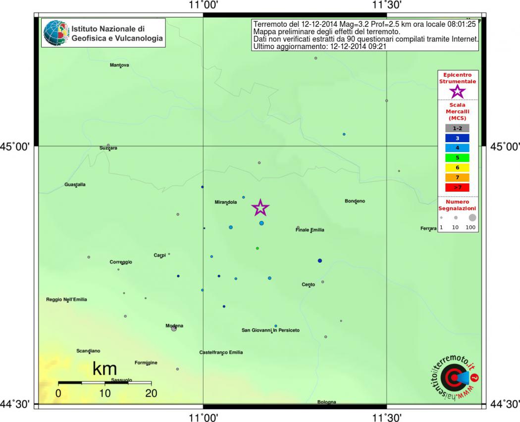 2. Nei casi come quello dell’Aquila, peraltro, è chiaro che chi abita nell’area epicentrale di un terremoto di magnitudo 6 le onde P le avverte da solo, e non ha certo bisogno di un avvisatore. Anche per la soglia 3-3.2 di cui si parlava sopra vale lo stesso discorso, se come probabile si intende in prossimità dell’epicentro. Provate a chiedere agli aquilani, o agli abitanti del modenese dove proprio poche ore fa (alle 8:01 del 12 dicembre) un terremoto di M3.2 è stato ben avvertito fino a oltre 30 km dall’epicentro.