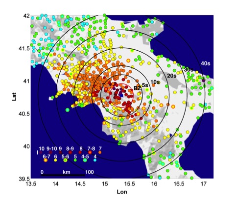Figura 3. Intensità macrosismica (effetti del terremoto osservati) e “lead-time” per il terremoto dell’Irpinia del 1980 (M 6.9) (da Picozzi et al., 2014). I lead-time sono stati simulati supponendo l’esistenza di un sistema di Early Warning basato su una Rete Accelerometrica Nazionale con la configurazione attuale ed operante in tempo-reale. L’intensità macrosismica per ciascuno dei Comuni in cui essa è stata rilevata, ed è rappresentata secondo la scala Mercalli-Cancani-Sieberg con i colori più scuri (arancione/rosso/marrone) associati ai livelli per cui sono stati osservati danni significativi alle abitazioni. Il cerchio più interno indica la Blind Zone (BZ), l’area entro cui l’allerta è emessa successivamente all’arrivo delle onde S, le più distruttive durante un terremoto. La figura mostra che un gran numero di Comuni ricadrebbe nelle aree a lead-time positivo, e per un numero consistente di essi sarebbero disponibili dai 5 ai 20 secondi per effettuare azioni automatiche o individuali di messa in sicurezza di persone o impianti.